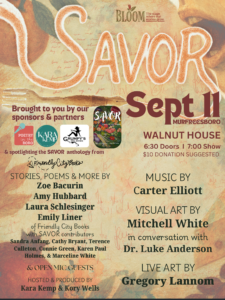 The Bloom Stage offers quarterly events that bring a blend of storytelling, poetry, music, and art to the Murfreesboro stage. The series is produced by storyteller and personal coach Kara J. Kemp with assistance from poet and writer Kory Wells and partnership with Poetry in the Boro. This series celebrates the ability of art to honor both the diversity and commonality of human experience, and to satisfy a vital human need for connection. It seeks to present established and emerging storytellers, poets, performers and artists and to encourage unity among communities whose stories often go unheard. Each show presents a broad theme for artists to build upon, such as “Defibrillator” for a February Valentine’s show, “Cornbread and Casseroles” for Mother’s Day and “The Dog Days” for an August show on furry friends, summer’s end and school’s beginning. Live musicians weave the stories together throughout the series as well as visual artists on exhibit.