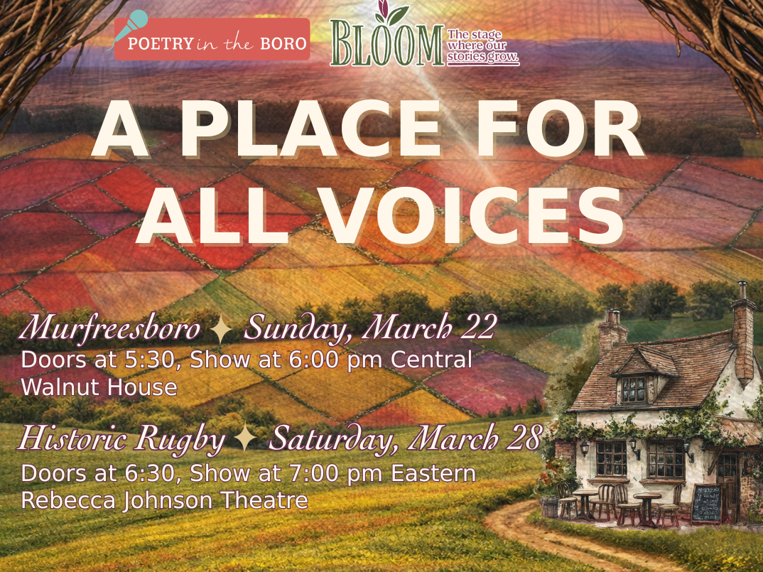 Bloom Stage proudly announces the first show in its 2026 series, “A Place for All Voices.” Produced in both Murfreesboro and Historic Rugby, Tennessee, this show will invite audience members to reflect on the impact of all creative communities through an entertaining evening of live performance and art. The show also serves as a release party for Poetry in the Boro’s 10th anniversary anthology, also titled A Place for All Voices.