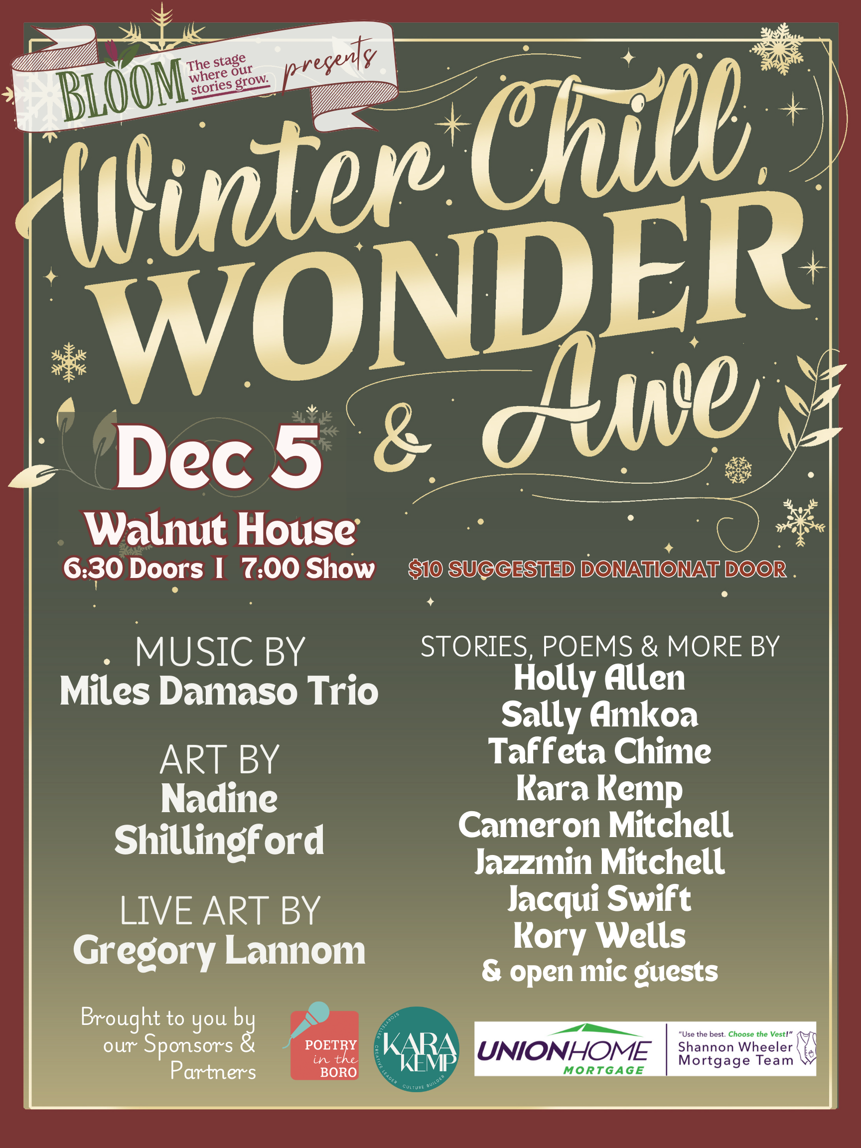 The Bloom Stage 2026 Season continues our mission of cultivating connection through intimate, multi-genre and multi-generational performances rooted in storytelling, music, poetry, movement, and visual art. Hosted at Walnut House in downtown Murfreesboro and extending across the region, this season reflects both deepened partnerships and meaningful expansion.